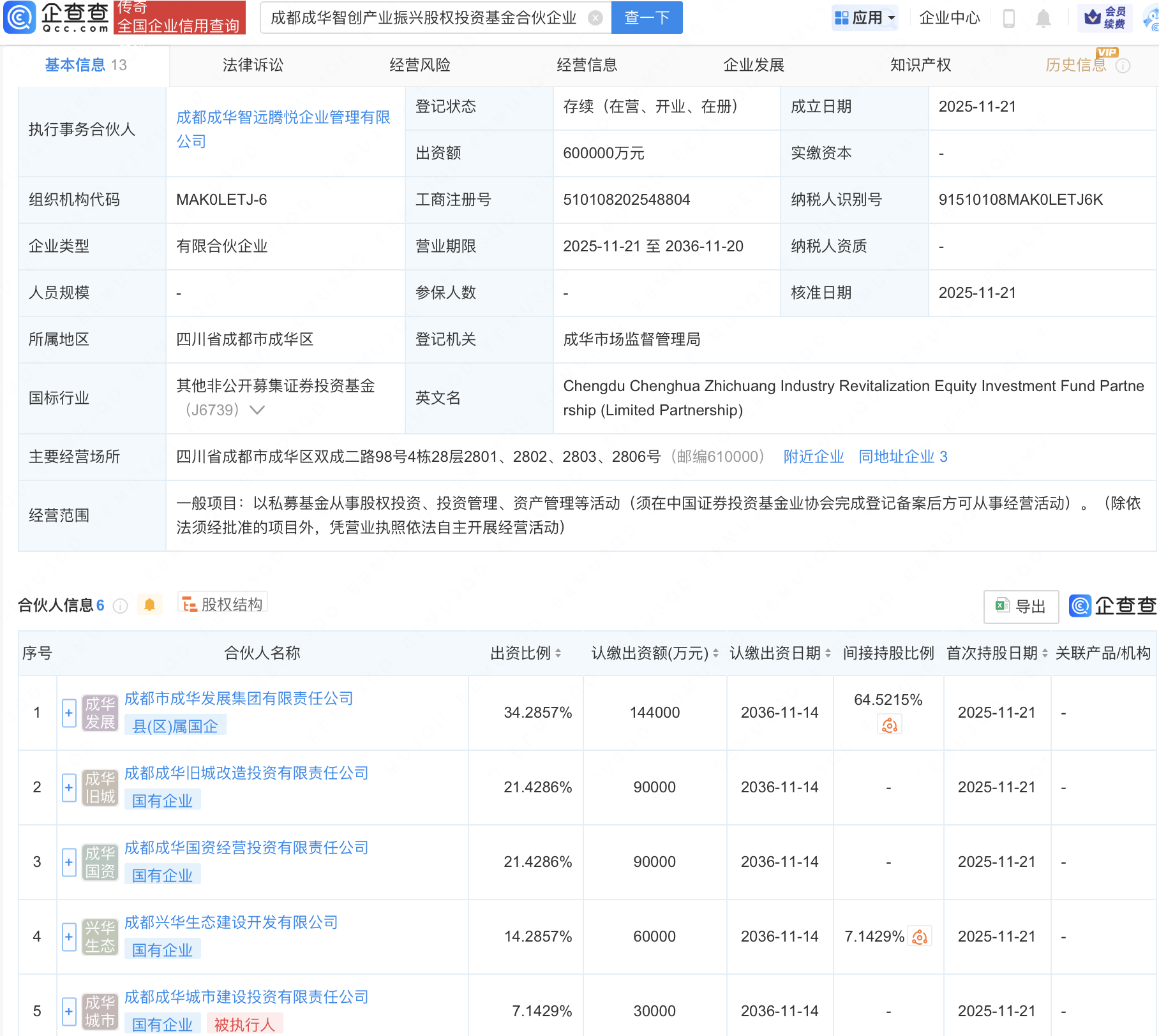 近日,成都成华智创产业振兴股权投资基金合伙企业(有限合伙)成立,出资额60亿元,经营范围包含:以私募基金从事股权投资、投资管理、资产管理等活动。企查查股权穿透显示,该企业由成都市成华发展集团有限责任公司、成都成华国资经营投资有限责任公司等共同出资。