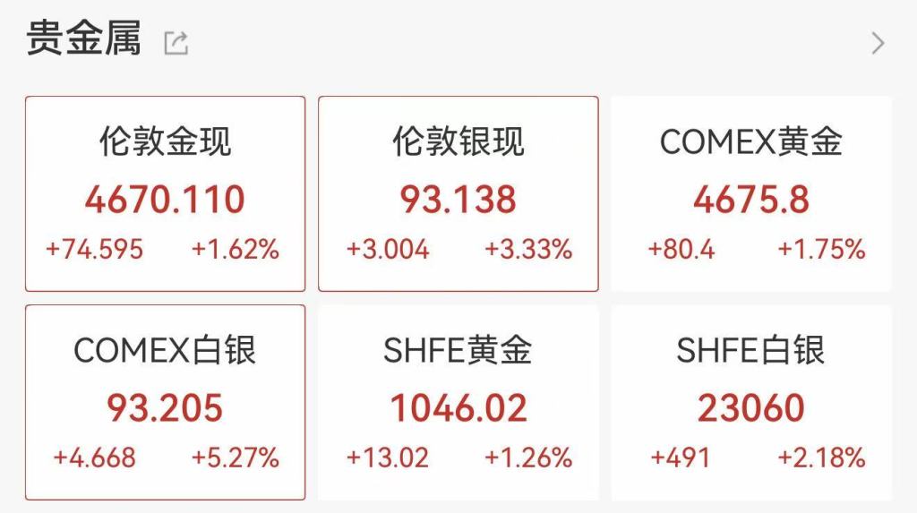 1月19日盘中,国际黄金、白银价格再创新高。现货黄金价格一度涨至4690.88美元/盎司,COMEX黄金一度涨至4698美元/盎司,涨幅均一度超过2%;现货白银价格最高涨至94.12美元/盎司,涨幅超过4%;COMEX白银价格最高涨至94.365美元/盎司,涨幅超过6%。截至发稿,以上品种涨幅均有所收窄。