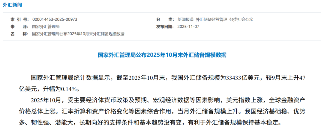 国家外汇管理局(下称外汇局)11月7日发布的最新统计数据显示,截至2025年10月末,中国外汇储备规模为33433亿美元,较9月末上升47亿美元,升幅为0.14%,为2015年12月以来的最高水平。目前,我国外汇储备已连续3个月稳定在3.3万亿美元以上。